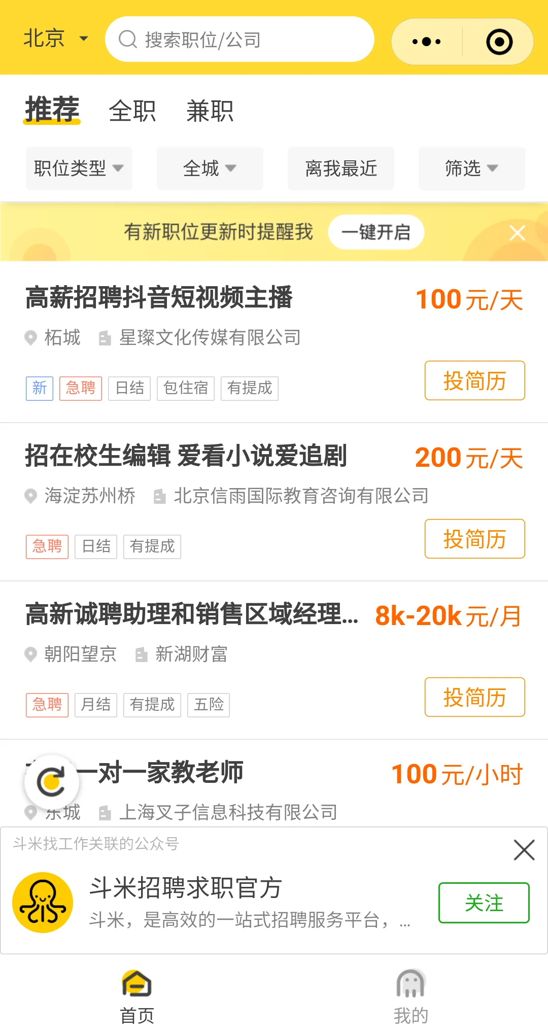 斗米找工作是集兼职和全职的求职招聘平台。服务学生和蓝领,岗位包含酒店餐饮服务员、快递员、送餐员、地推传单、话务客服、销售、商场超市售货员等,还有众多知名企业,真实岗位助你快速找到满意工作,迅速面试,工资涨得比房价快,早日买上新 iPhone !