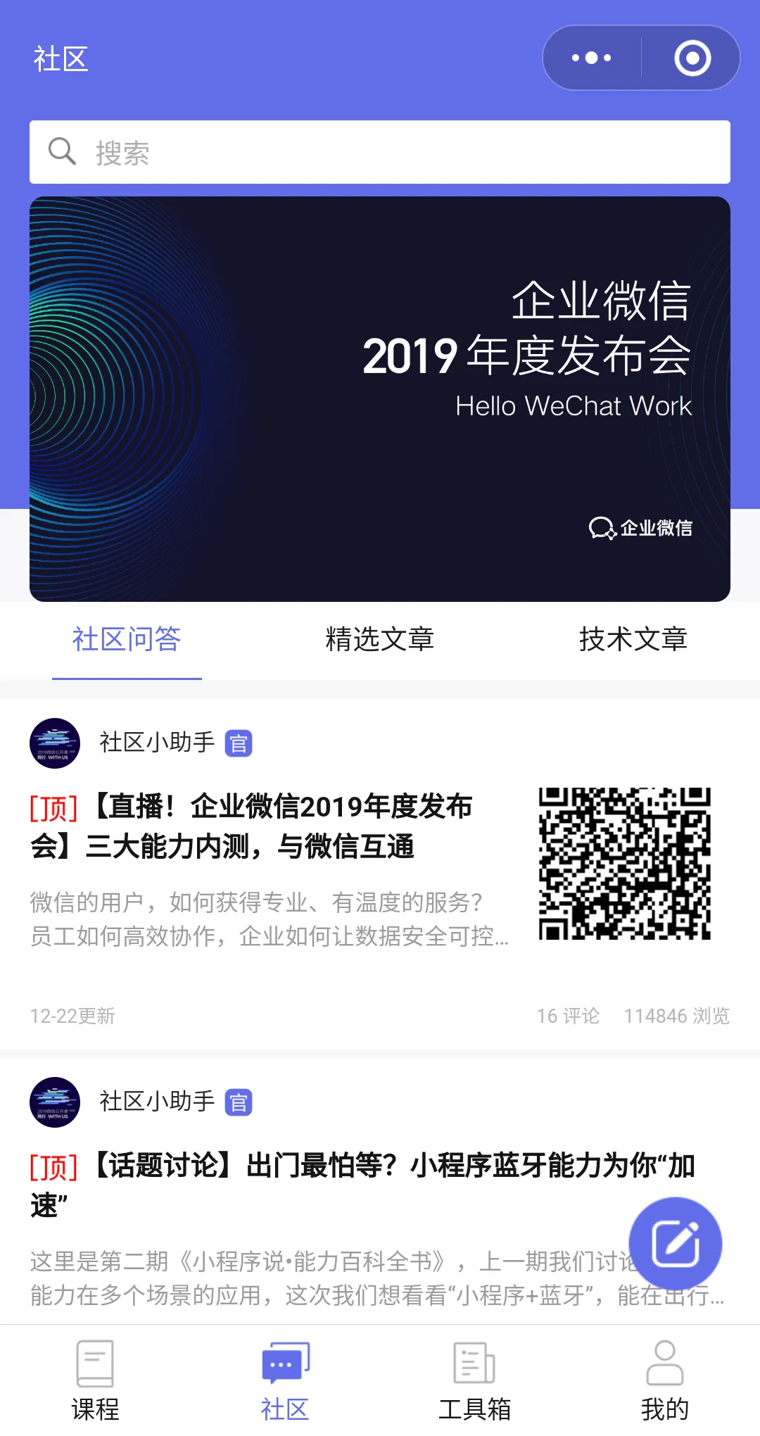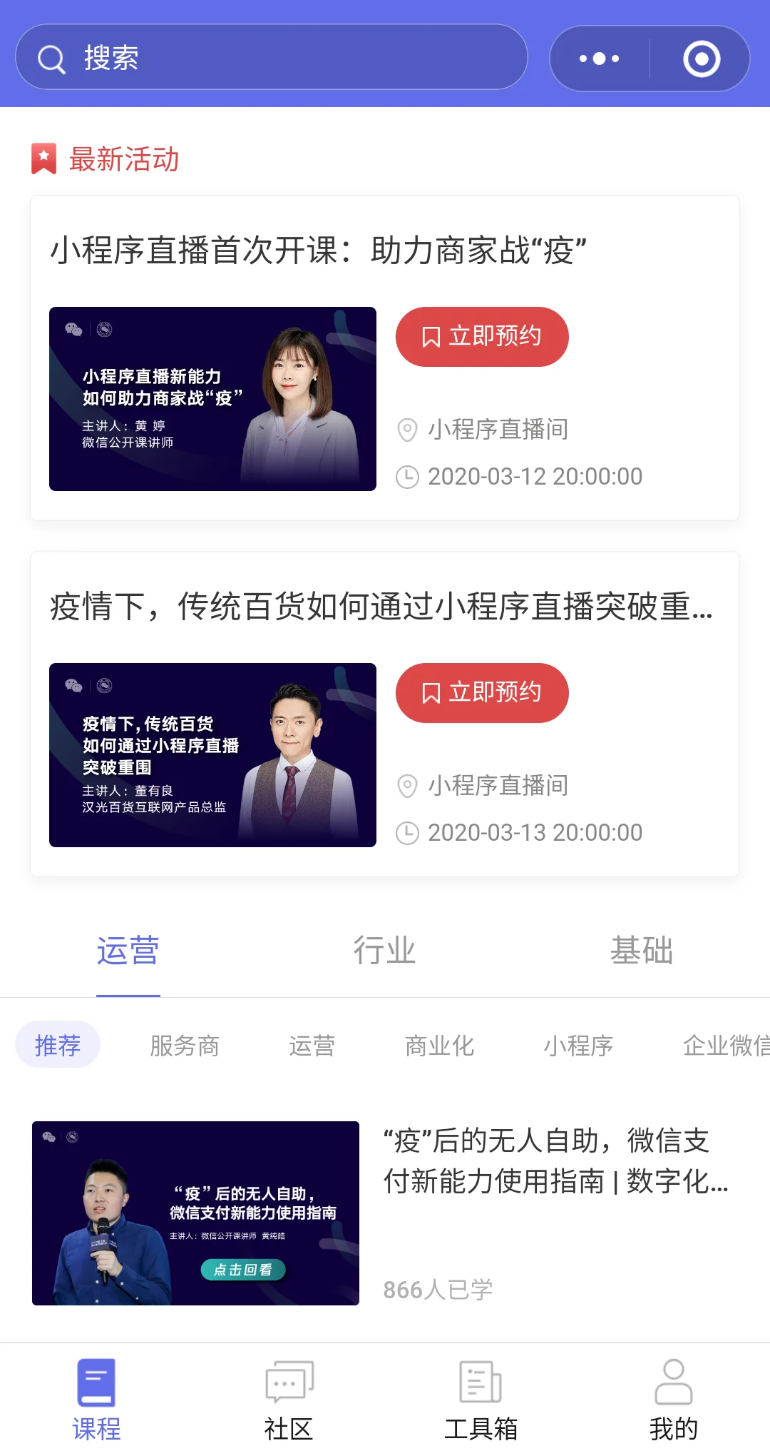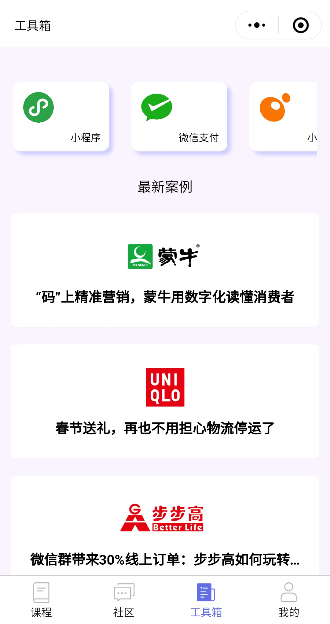 微信官方与行业合作伙伴沟通的小工具,为线下微信公开课的免费授课提供线上的相关服务,包括查阅活动议程、参与活动互动以及回顾课程内容等。
