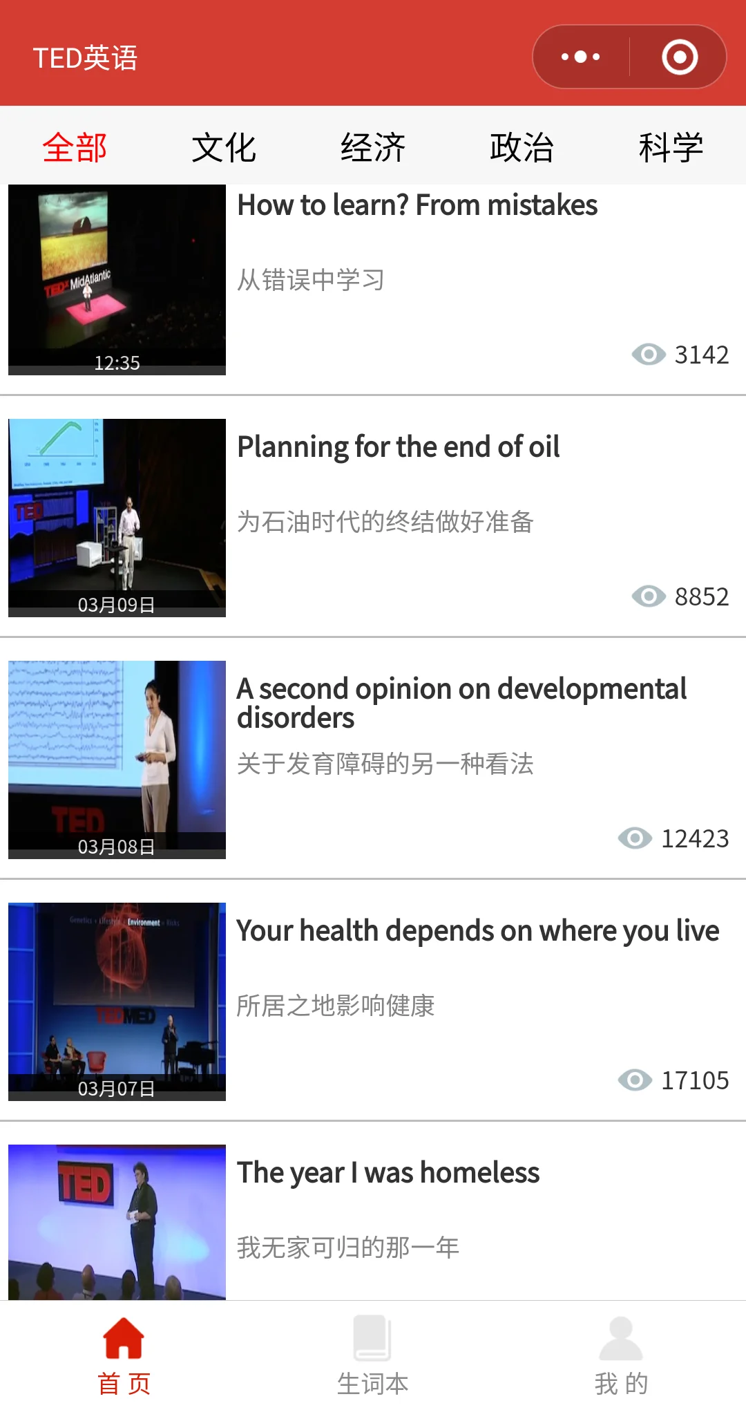 TED英语演讲视频,强大的跟读评测实时单词点击查询功能,生词库,收藏推荐你最爱的演讲,打卡记录学习时长。