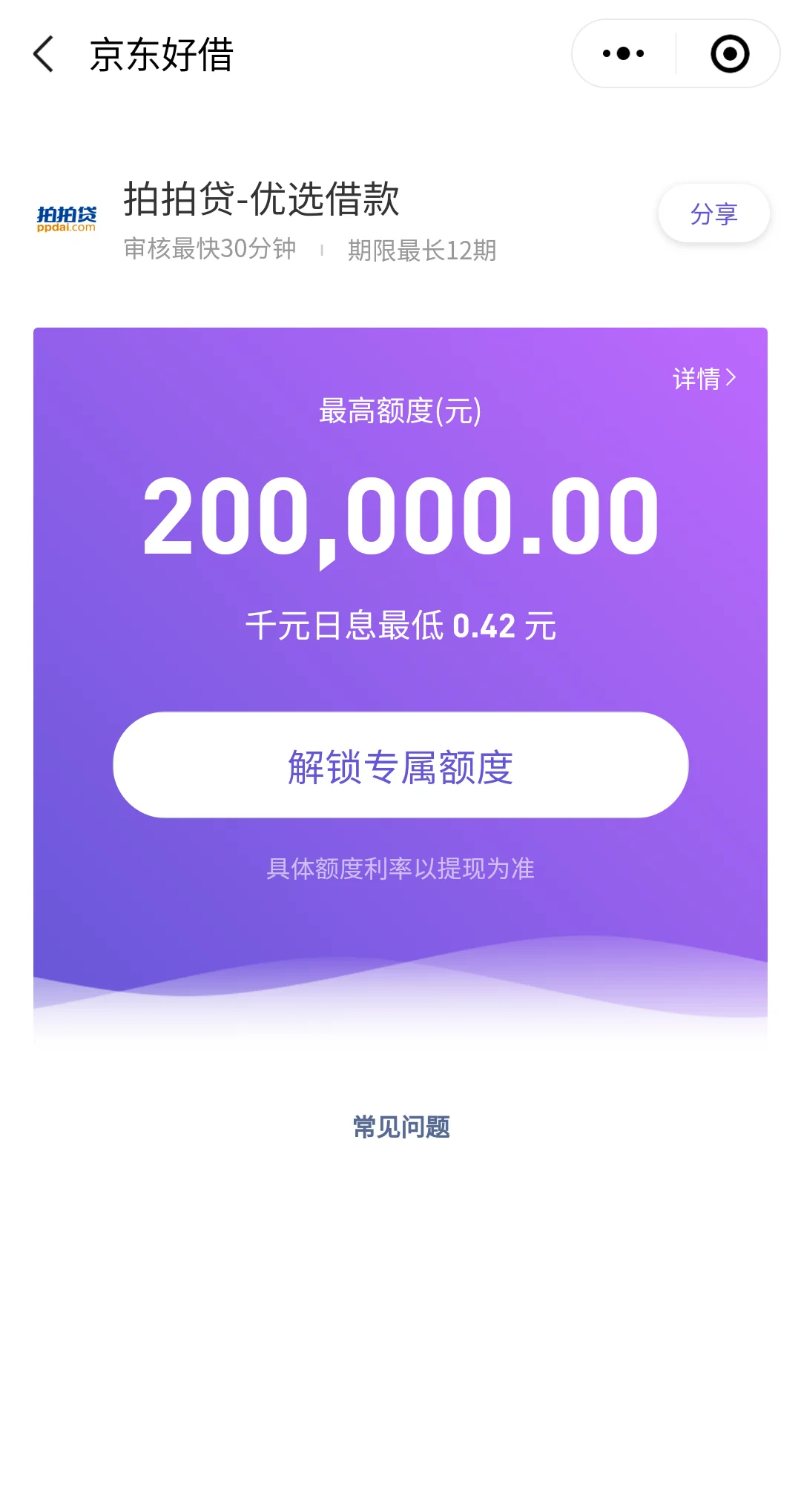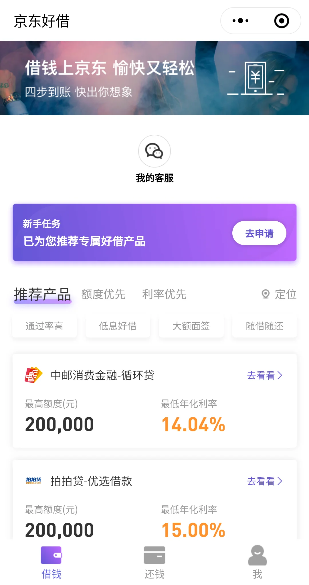京东好借是京东旗下贷款平台。京东好借是由京东金融推出的京东信贷平台下的互联网信贷产品快速申请平台,由银行、消费金融、小额贷款公司等金融机构为用户提供的线上无抵押贷款,有建行、马上金融、招联、中邮等多家资金方,借钱额度高,利率低,放款快。最高可借20万。借1000元,日息低至3毛。多产品多选择,总有一款适合你。