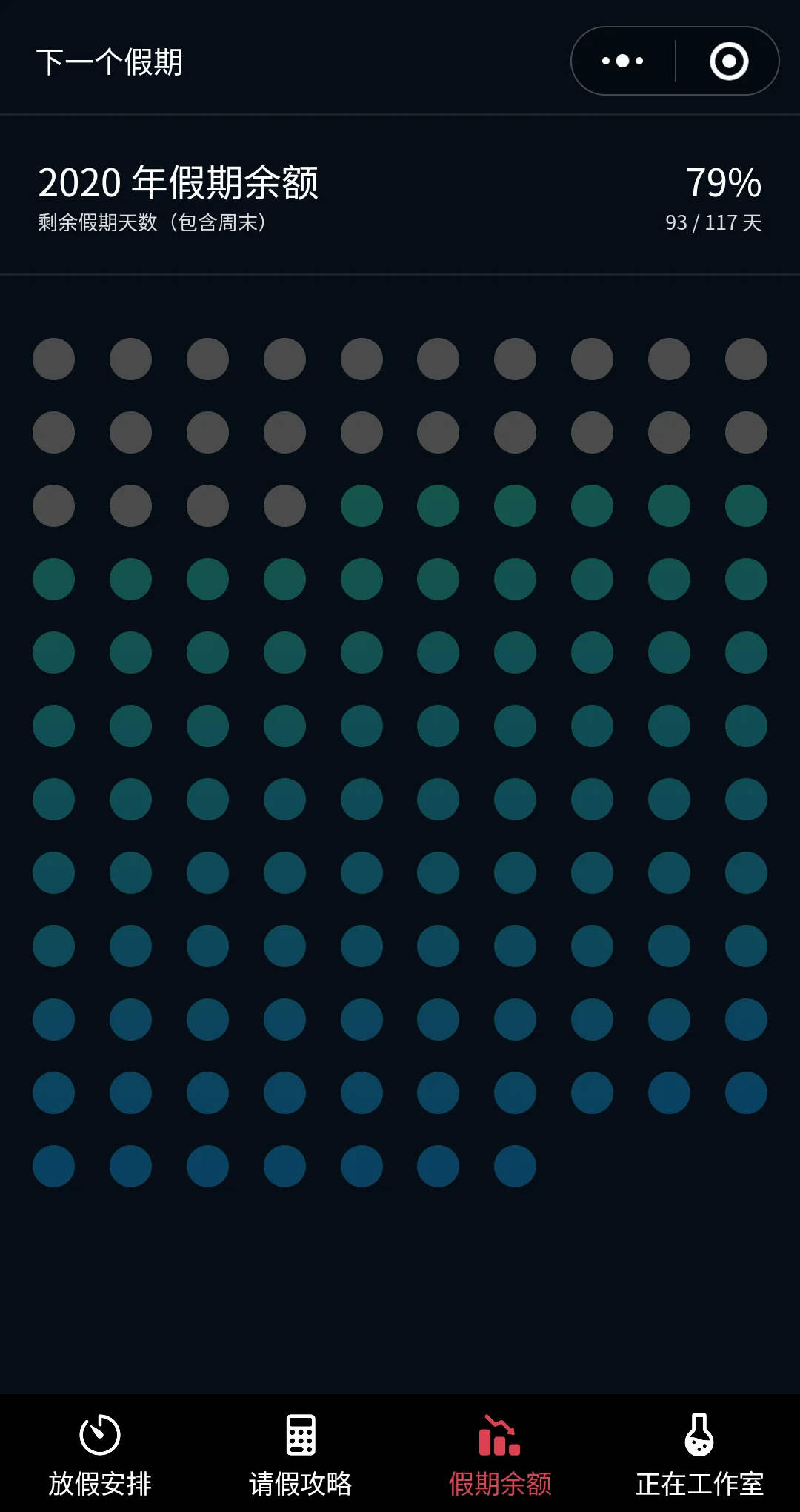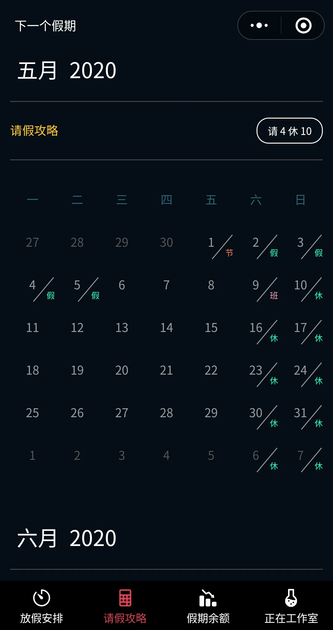 法定节假日放假安排、下一个假期倒计时、假期余额、请假攻略。